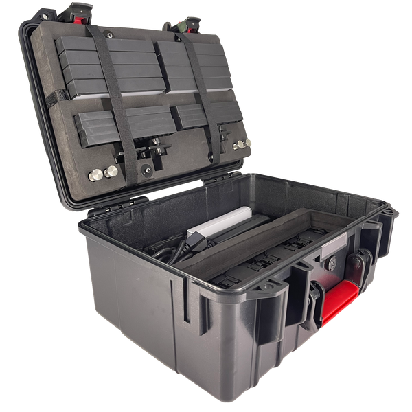Kit of 4 HydraPanels with beam modifiers and mounting accessories stored in a durable protective plastic case.