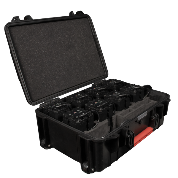 Kit of 8 PixelBricks with essential accessories stored in a durable protective plastic case with wheels and retractable handle.